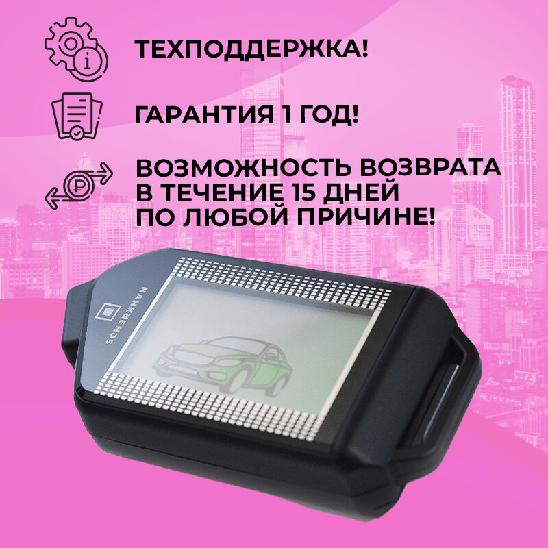| Функции и возможности | аудиовизуальное выполнение команд / блокировки кнопок / будильник / вкл/выкл режима охраны одной кнопкой / напоминание о пропущенной тревоге / подсветка дисплея |