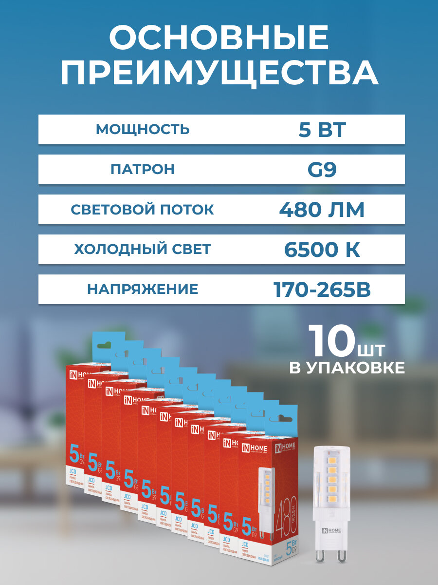 10 цен на Лампа светодиодная LED-JCD 5Вт 230В G9 6500К, холодный свет, 480Лм IN HOME, 10 штук
