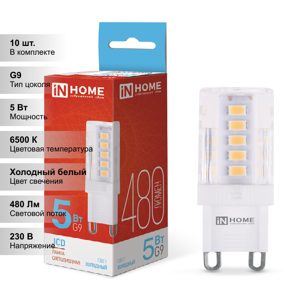 Лампа светодиодная LED-JCD 5Вт 230В G9 6500К, холодный свет, 480Лм IN HOME, 10 штук информация: