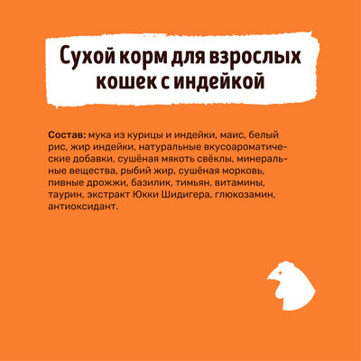 | Состав | мука из курицы и индейки, цельные злаки (маис), белый рис, мясо и печень кролика гидролизованные, куриный жир, натуральные вкусо-ароматические добавки, сушёная мякоть свёклы, минеральные вещества, рыбий жир, витамины (в т.ч. таурин), сушёная морковь, семя льна, пивные дрожжи, экстракт юкки Шидигера, глюкозамин, антиоксидант |