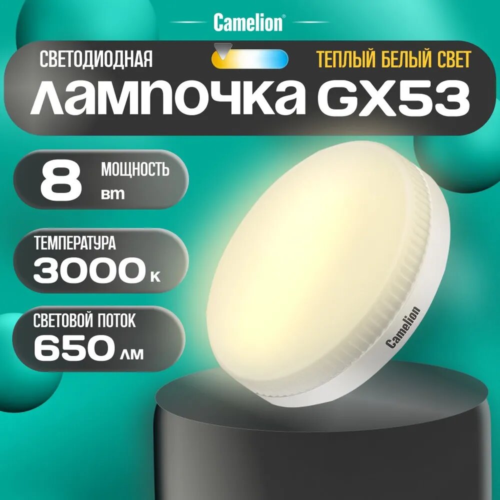Лампочка светодиодная Camelion LED8 GX53 3000К тёплый свет информация: