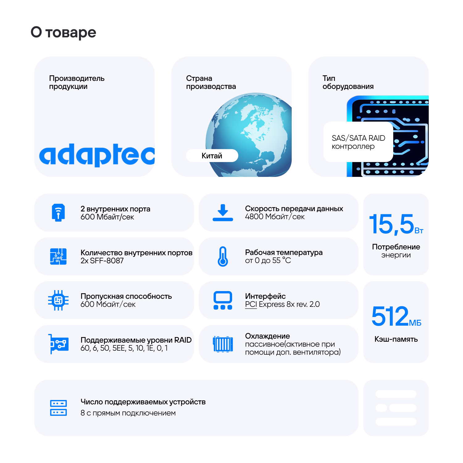 Контроллер Adaptec ASR-6805 PCI-E x8 8хSAS /SATA 6Gb 512Mb 2270100-R 489191-001 совместим с DL160Gen8 информация: