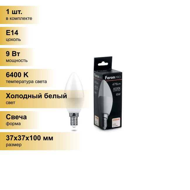 Лампа Feron OSRAM LED LB-1309 C37 9W E14 6400K 230V свеча