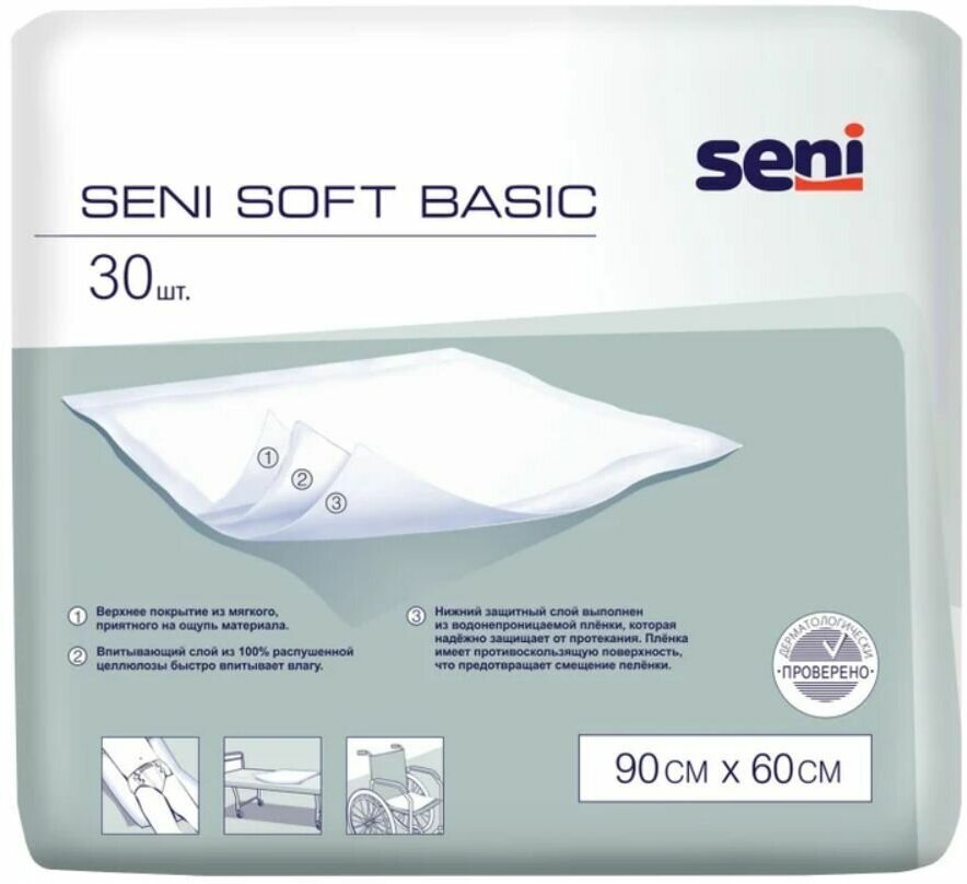 Пеленки 60×90 см, SENI SOFT BASIC, комплект 30 шт., впитывающие, одноразовые