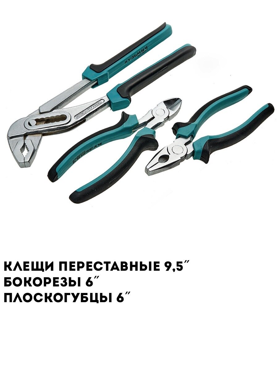 | Шарнирно-губцевый инструмент подробно | клещи переставные 9,5"; бокорезы 6"; плоскогубцы 6" |