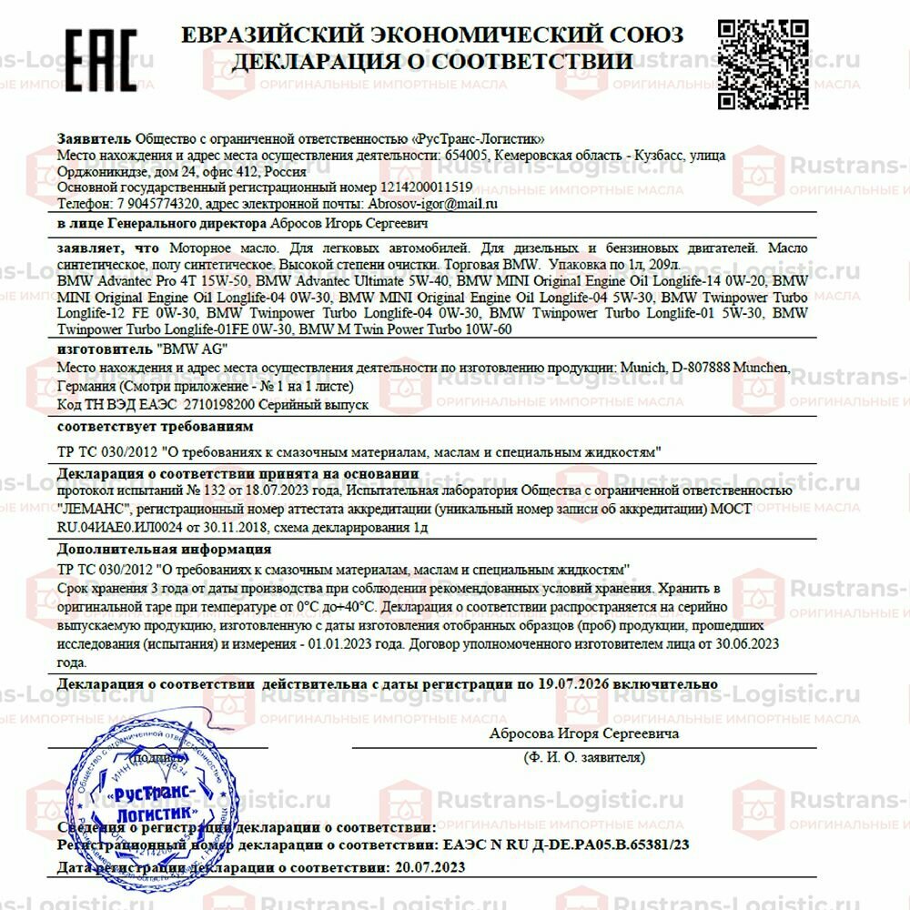 10 цен на Масло моторное BMW SN 10W-60 LONGLIFE-01 (Германия), (1л), масло синтетика 10w60 для автомобиля БМВ 83212365924, РТЛ