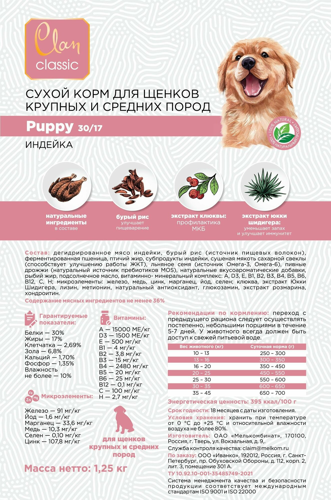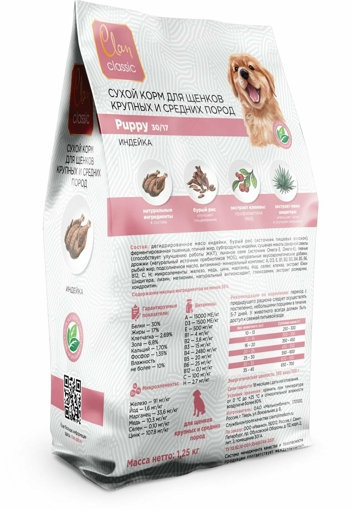 CLAN CLASSIC Puppy-30/17 корм сухой для щенков крупных и средних пород Индейка 1.25кг информация: