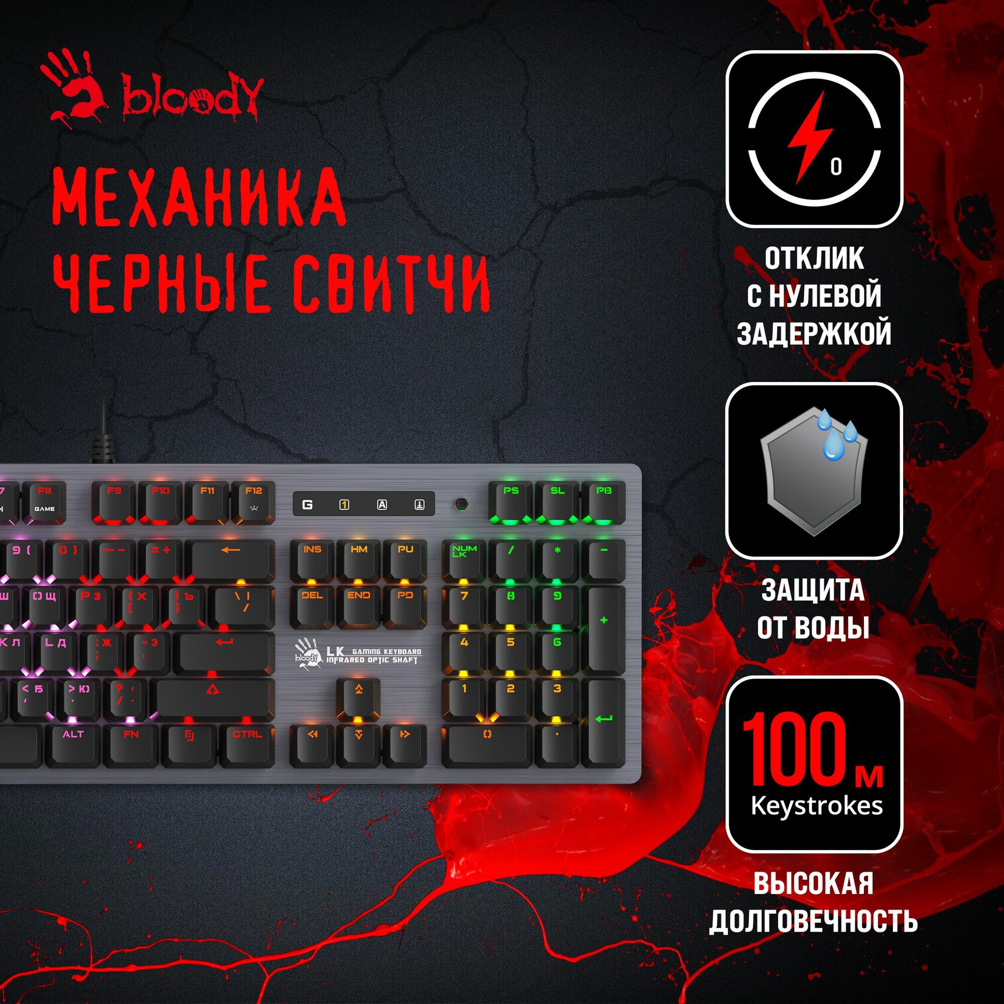 | Дополнительная информация | время отклика: 0.2 мс; частота опроса: 1000 Гц; мультимедийные горячие клавиши: есть; яркость подсветки: регулируемая; пробел: усиленный; ресурс клавиш: до 100 млн. нажатий; системные требования: Windows XP/ Vista/ 7/ 8 /8.1 / 10 и более поздние версии; модель переключателей: A4Tech LK Light Strike Black; тип переключателей: линейные; материал кейкапов ABS |
