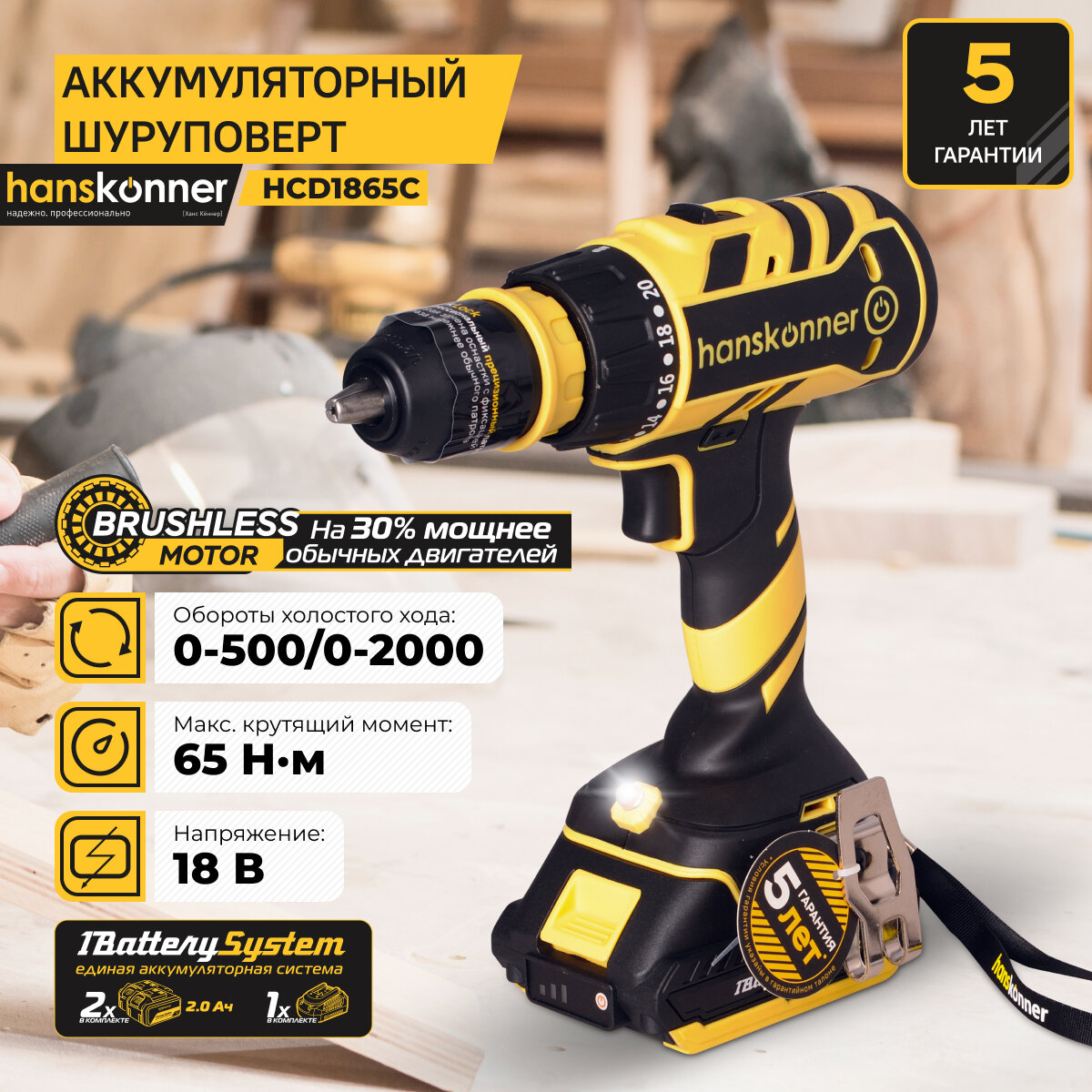 Дрель-шуруповерт аккумуляторный Hanskonner HCD1865C, Li-on, 18 В, 2 Ач, 65 Нм, 2 АКБ и З/У, единая акб система