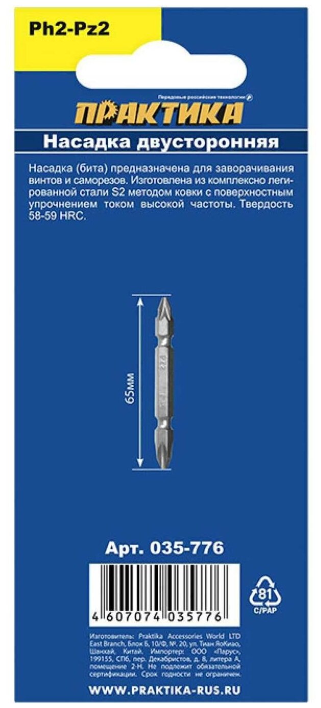ПРАКТИКА Биты двусторонние PH2-PZ2 60мм Профи 2 шт в блистер 035-776