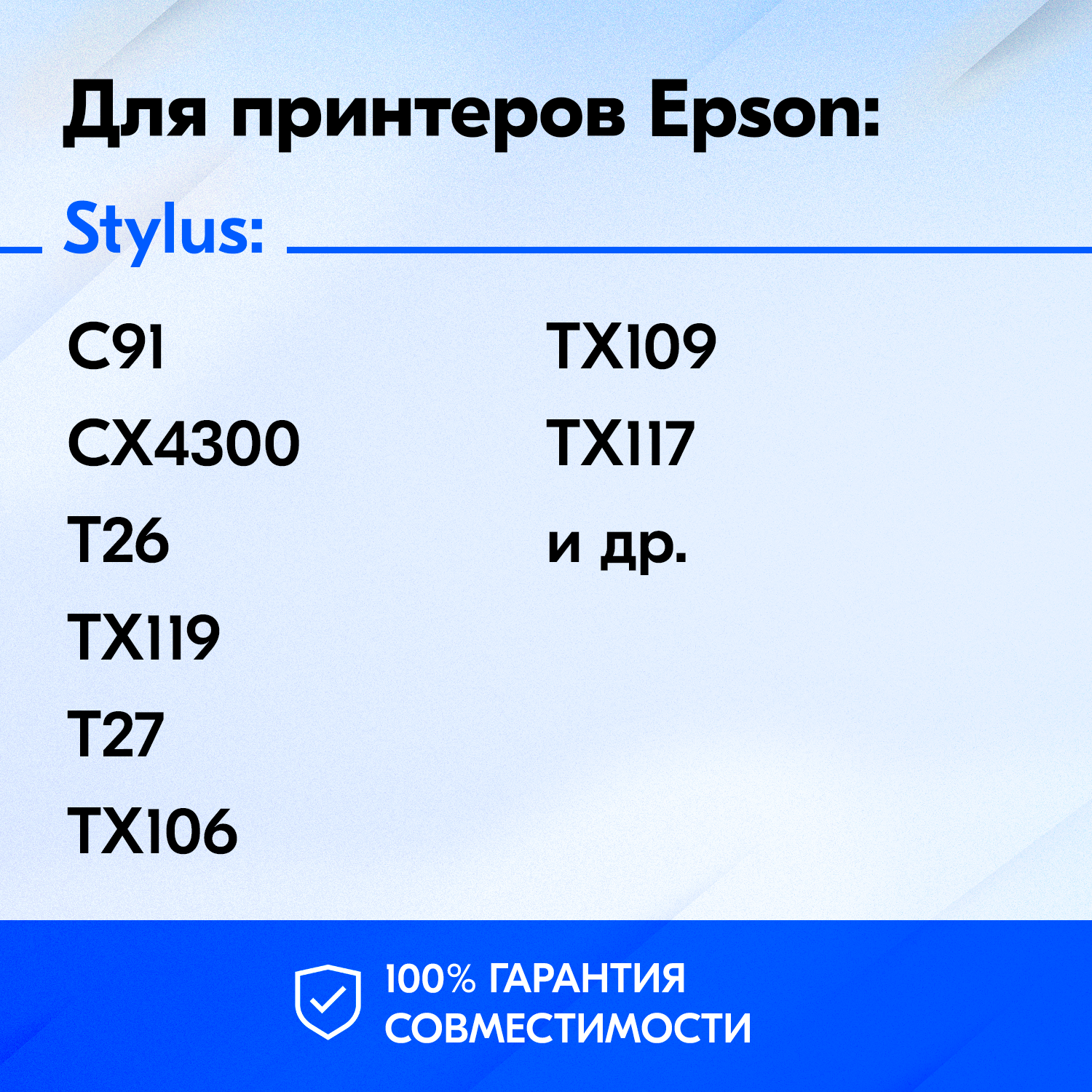| Модель совместимого принтера | Epson Stylus C91 / Epson Stylus CX4300 / Epson Stylus T26 / Epson Stylus T27 / Epson Stylus TX106 / Epson Stylus TX109 / Epson Stylus TX117 / Epson Stylus TX119 |