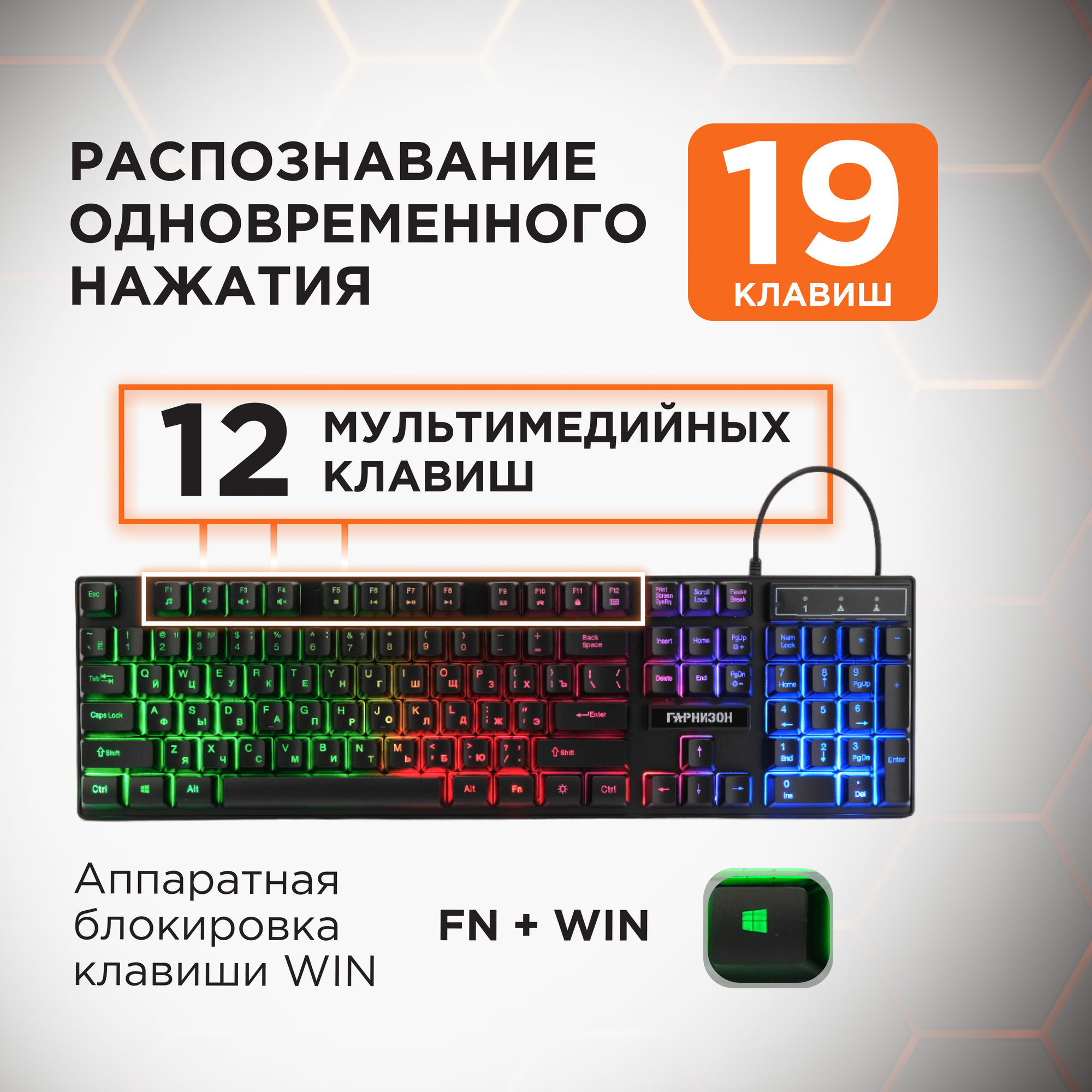 Клавиатура Гарнизон GK-350L, Rainbow, USB, черный, подставка для запястий, антифантальные клавиши, 12 дополнительных функций, кабель 1,5 м