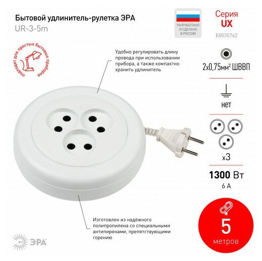 ЭРА сет. удл. рулетка ШВВП 2х0.75 3 роз. 5 м (корпус ABS-пластик) UR(6)-3-5m (РФ)/УХ6-103 5158 (арт. 698540) информация: