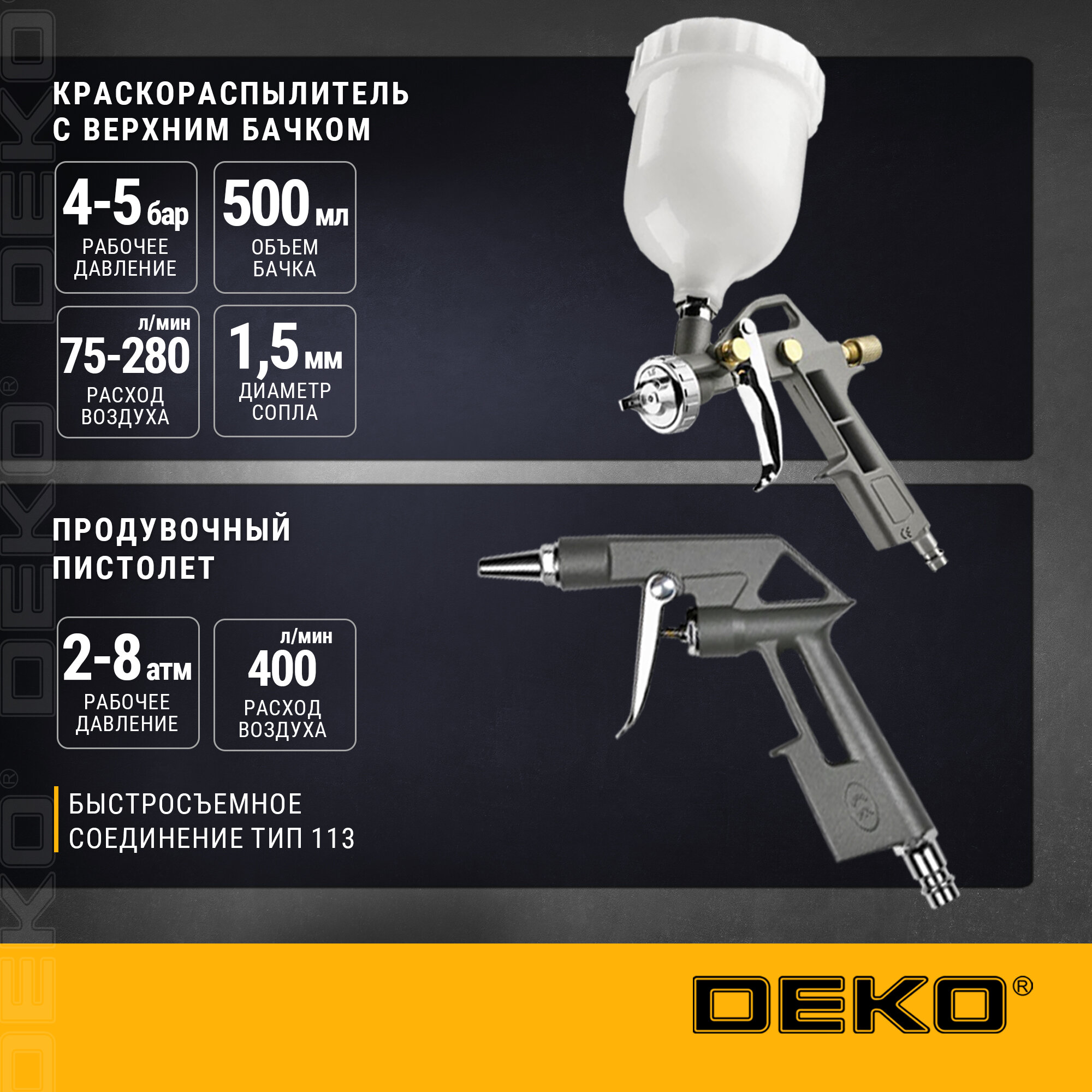 Отзывы на Набор пневмоинструментов DEKO, DKSG05, краскопульт и пистолеты, шланг, байонет, 8 атм