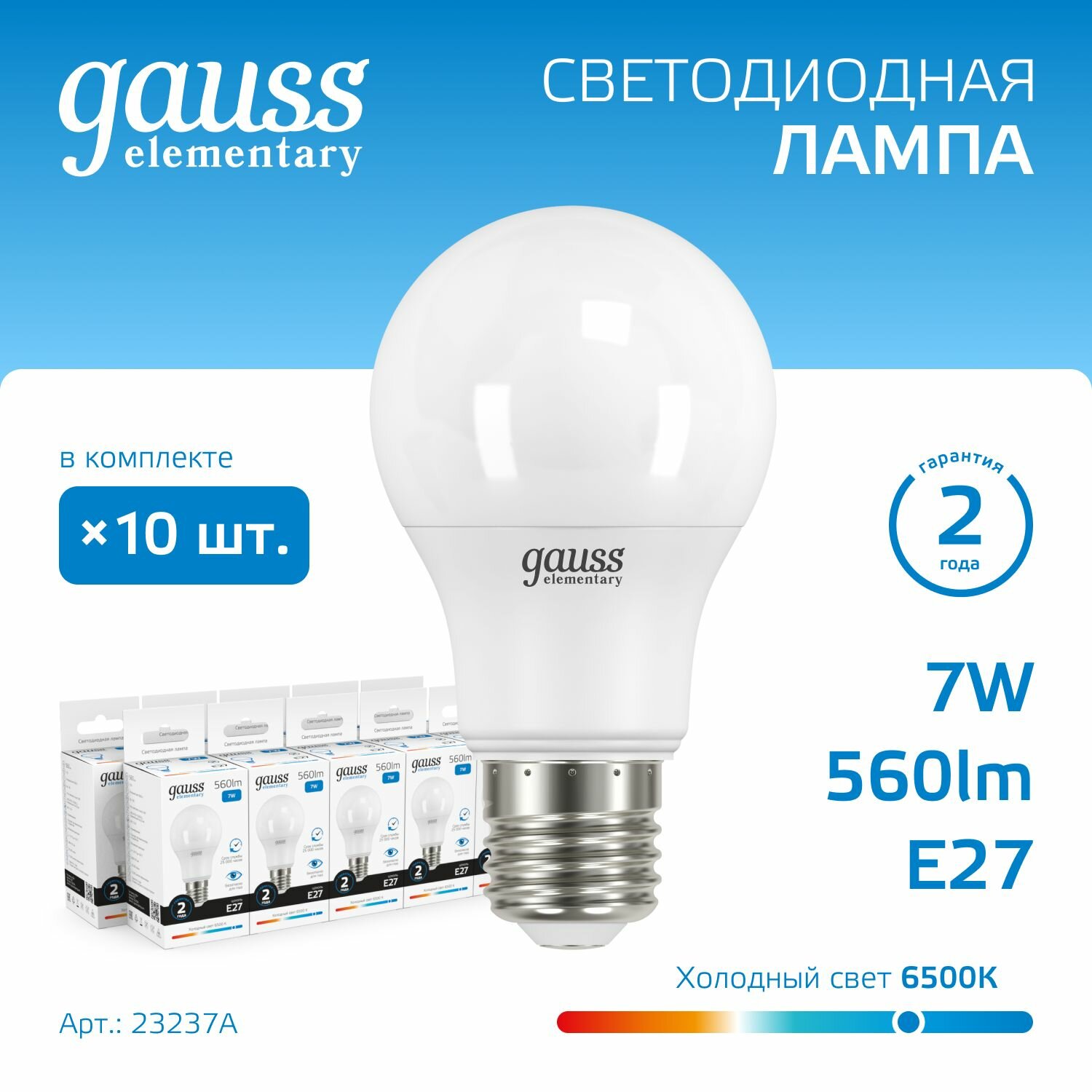Лампочка светодиодная Е27 Груша 7W холодный белый свет 6500К упаковка 10 шт. Gauss Elementary информация: