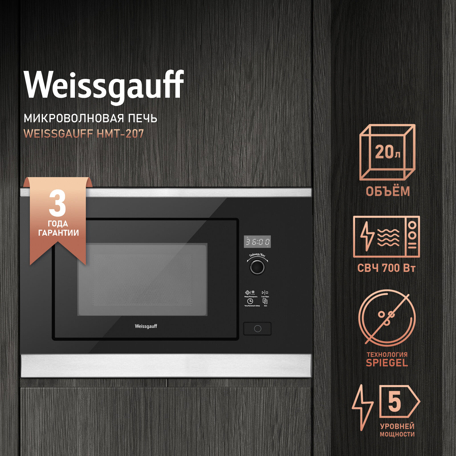 10 цен на Встраиваемая микроволновая печь без поворотного стола Weissgauff HMT-207, Поворотный переключатель Soft Switch