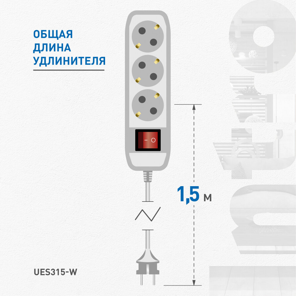 Удлинитель Intro UES315-W сетевой электрический бытовой с заземлением с выключателем 3 розетки, 1,5 м, ПВС 3х0,75мм2, 10А, белый