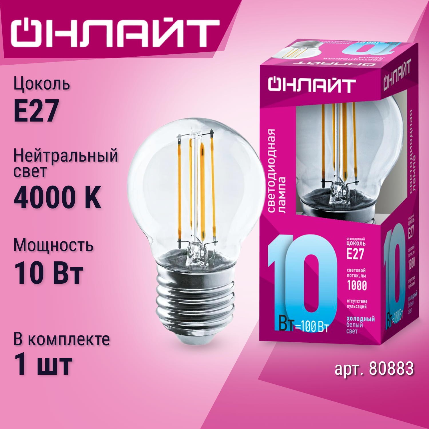 Лампа светодиодная филаментная 80 883 OLL-F-G45-10-230-4K-E27 10Вт шар прозрачная 4000К нейтр. бел. E27 1000лм 220-240В онлайт 80883