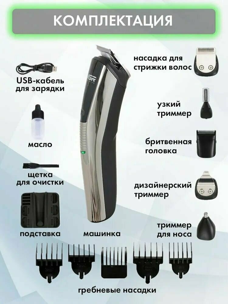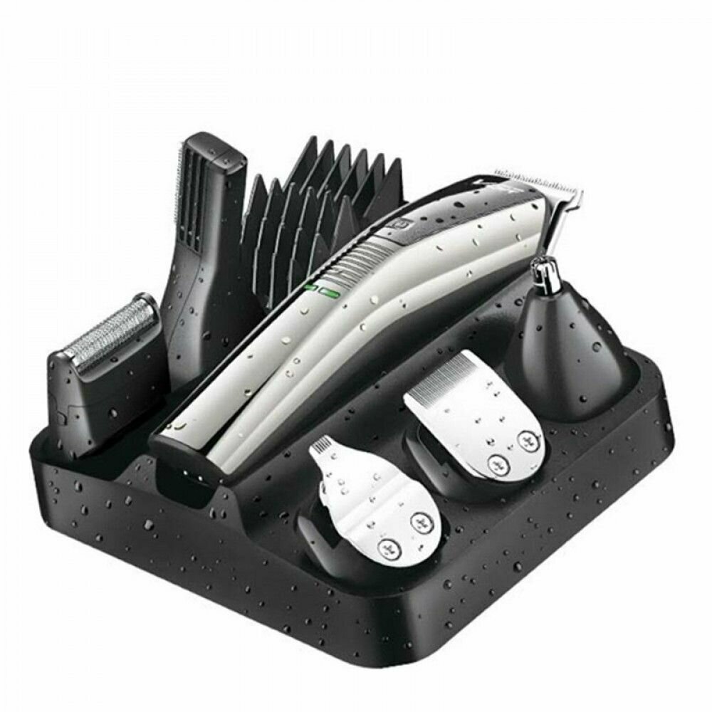 | В комплекте | кабель USB / масло / подставка для зарядки / щеточка / 1 * машинка 5 * гребневых насадок 1 * узкий триммер 1 * триммер для носа 1 * дизайнерский триммер 1 * насадка для стрижки волос 1 * бритвенная головка 1 * база 1 * USB-кабель 1 * щетка для очистки 1 * масло |