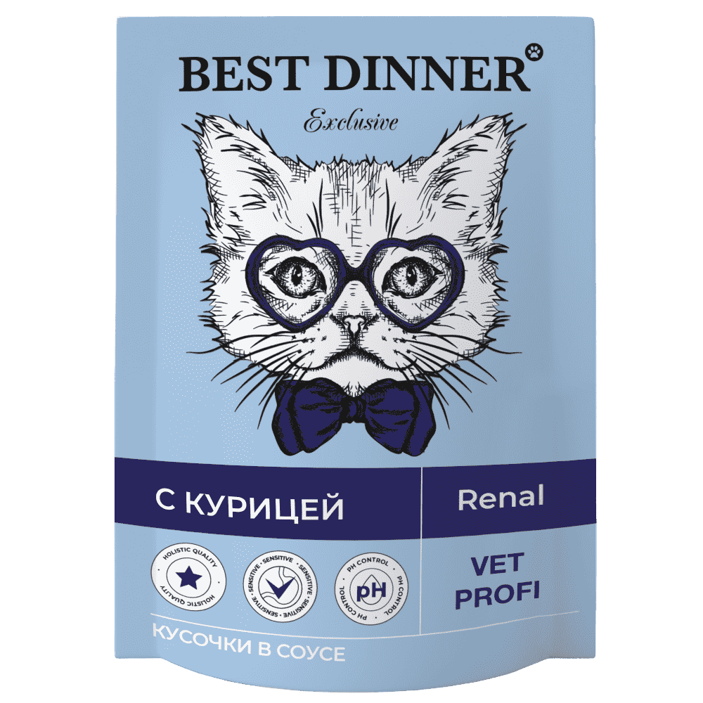 10 цен на Best Dinner Exclusive Vet Profi Renal диетические паучи для взрослых кошек для профилактики заболеваний почек, с курицей, кусочки в соусе - 85 г х 24 шт