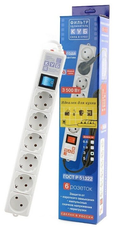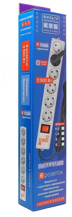 Сетевой фильтр Power Cube 5+1 розеток, 3.0м, белый (16A, макс. нагрузка 3.5 кВт) SPG(5+1)-16B-3М
