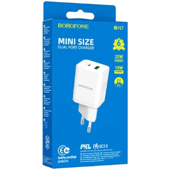 Сетевое зарядное устройство Borofone , BN7 1xUSB, 1xUSB-C, 20 Вт, 3A, QC3.0, белый информация: