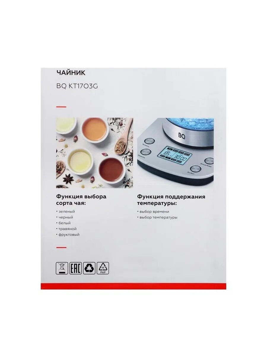 Чайник электрический BQ KT1703G, стекло, 1.7 л, 2200 Вт, чёрно-серебристый 8 482 ₽