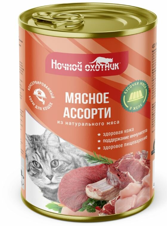Консервированный корм Ночной охотник, мясное ассорти кусочки в желе, 415 гр х 20шт.