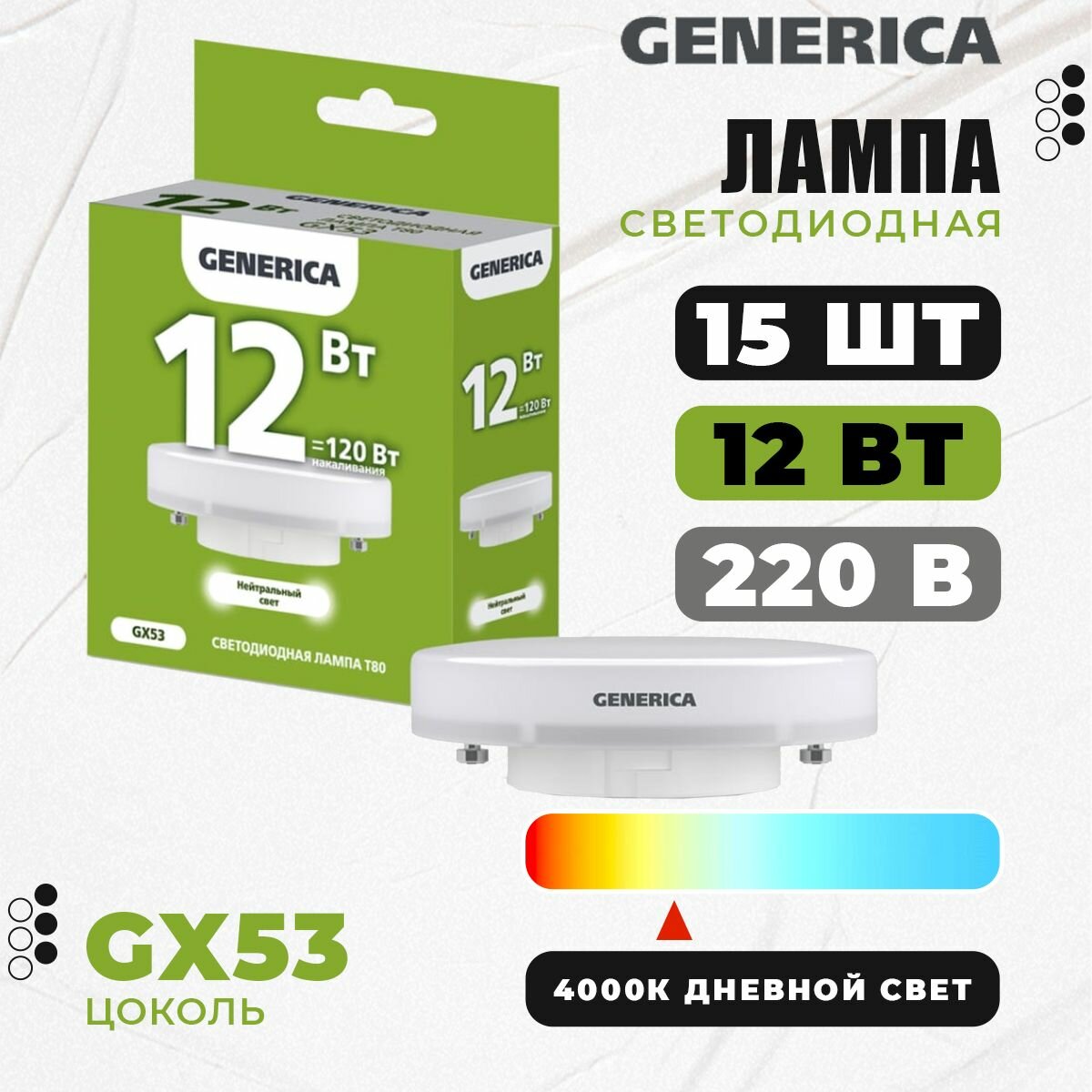 (15 шт.) Светодиодная лампочка GENERICA LED T80 таблетка, мощность 15 Вт, напряжение питания 220 В, цветовая температура 6500 К, Холодный белый свет, цоколь GX53, размер 73х28 мм 2 468 ₽