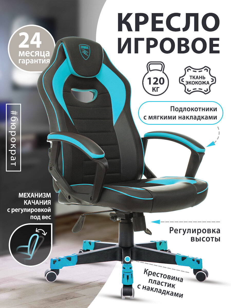 Игровое кресло Бюрократ ZOMBIE GAME 16 Черный, экокожа, ткань / Голубой, экокожа