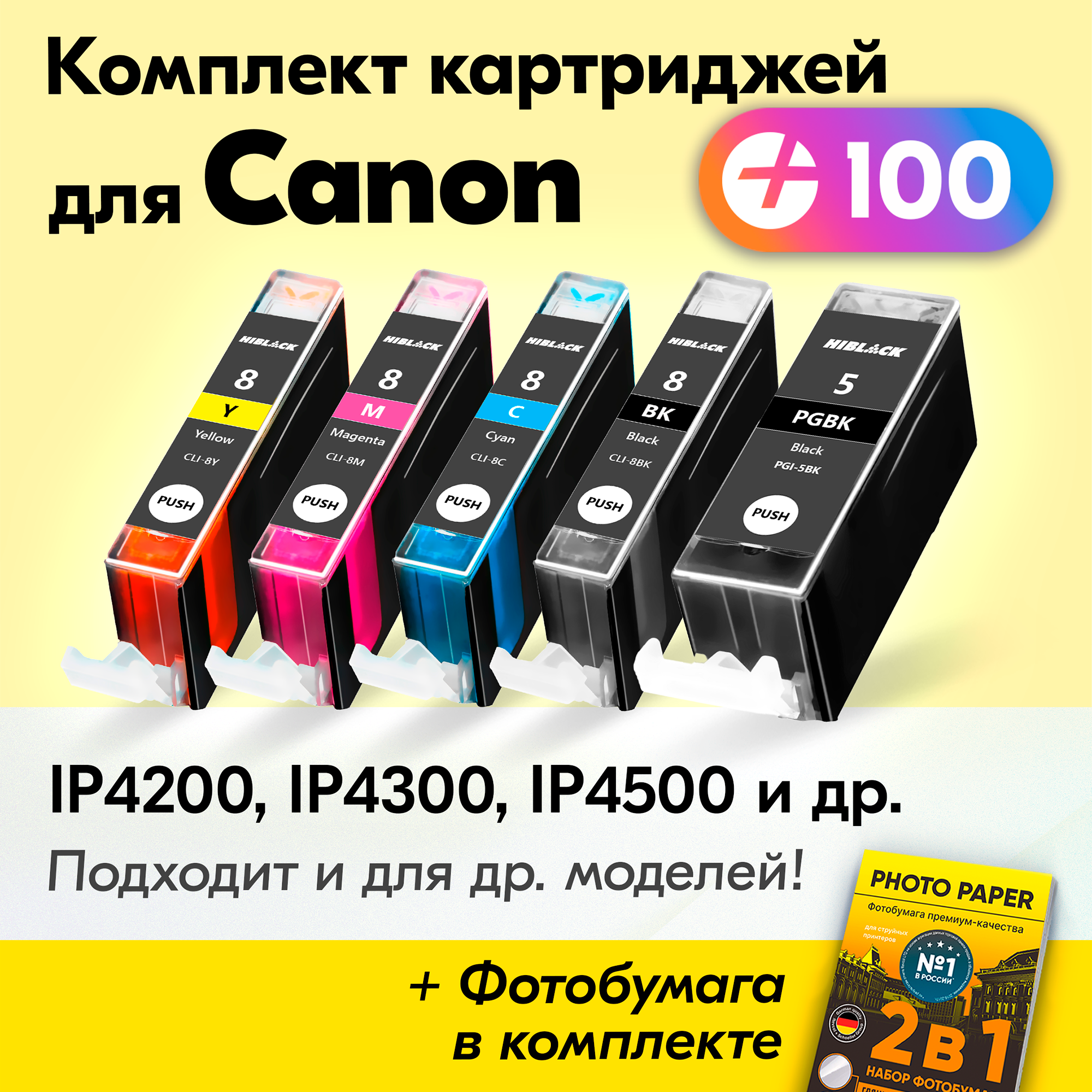Картриджи для Сanon PGI-5, CLI-8, Сanon iX4000, iP3300, iP3500, iP4200, iP4300, iP4500, iP5200 и др. с чернилами (с краской) для струйного принтера, Черный, Фото Черный, Голубой, Пурпурный, Желтый увеличенный объем, заправляемые, 5 шт. информация: