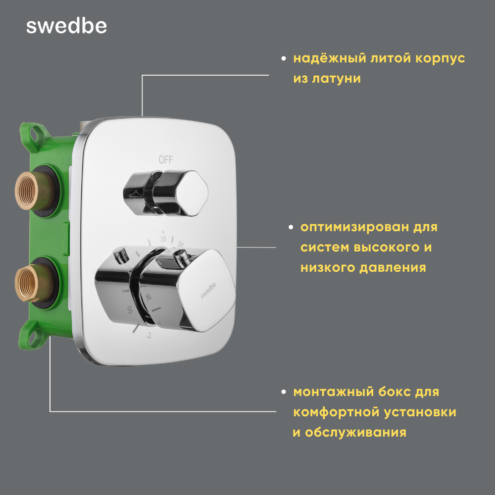 Встраиваемый термостатический смеситель с подключением на 2 выхода в монтажном боксе Swedbe информация: