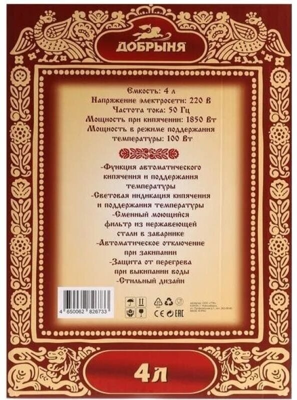 Самовар электрический Термопот Добрыня DO-430 4 л жостово чер/кер заварник 1 л (OL) 6 690 ₽