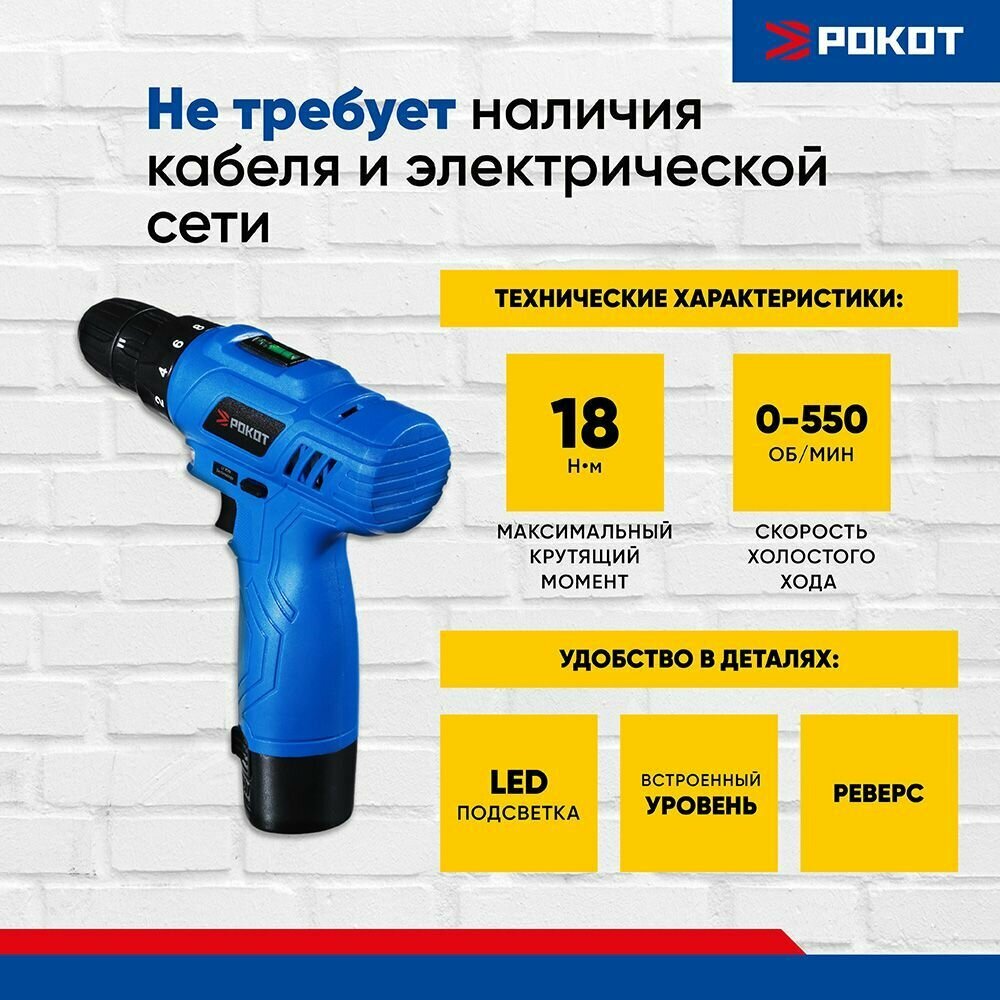 Дрель-шуруповерт рокот аккумуляторная ДША-12В, 0-550 об/мин, 1,3 Li-on (1), 18 н*м информация: