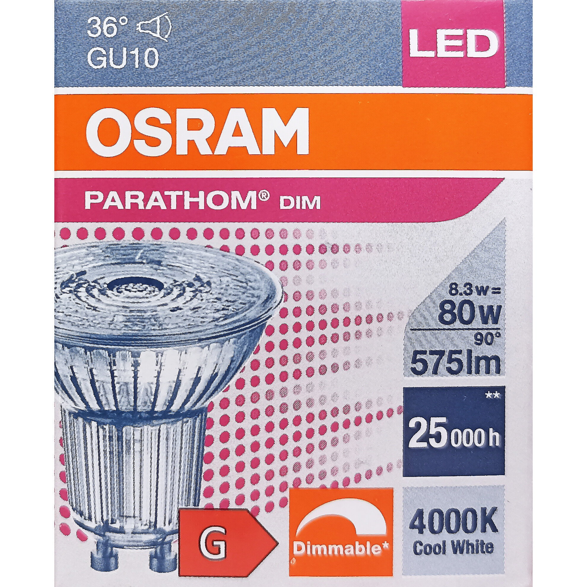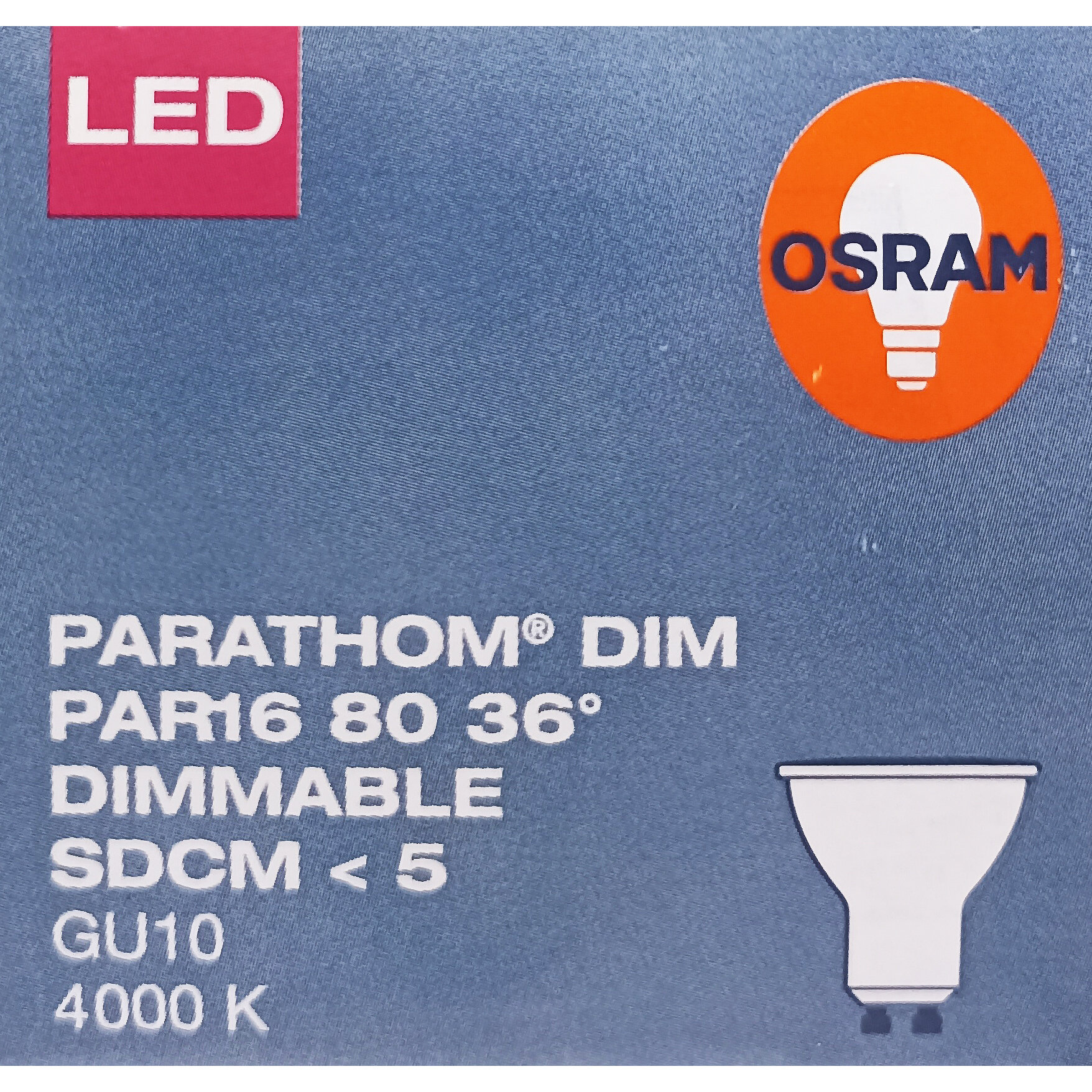 10 цен на 5 шт/уп. Лампа LED Софит 8.3W 220-240V GU10 PAR16 575Лм 4000К Угол 36 град. D-50mm L-52mm Диммируемая Свет Нейтральный белый OSRAM, уп. 5шт