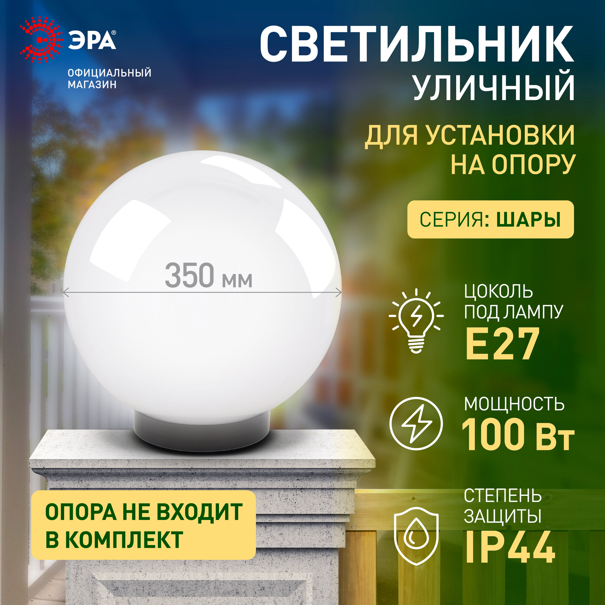Мы выбрали 10 лучших цен на Светильник уличный шар на столб ЭРА НТУ 02-100-351 белый 220в, D350mm, Е27. Перед тем как купить Светильник уличный шар на столб ЭРА НТУ 02-100-351 белый 220в, D350mm, Е27 посмотрите найденные предложения из Яндекс Маркета и других сайтов на основе XML фидов.