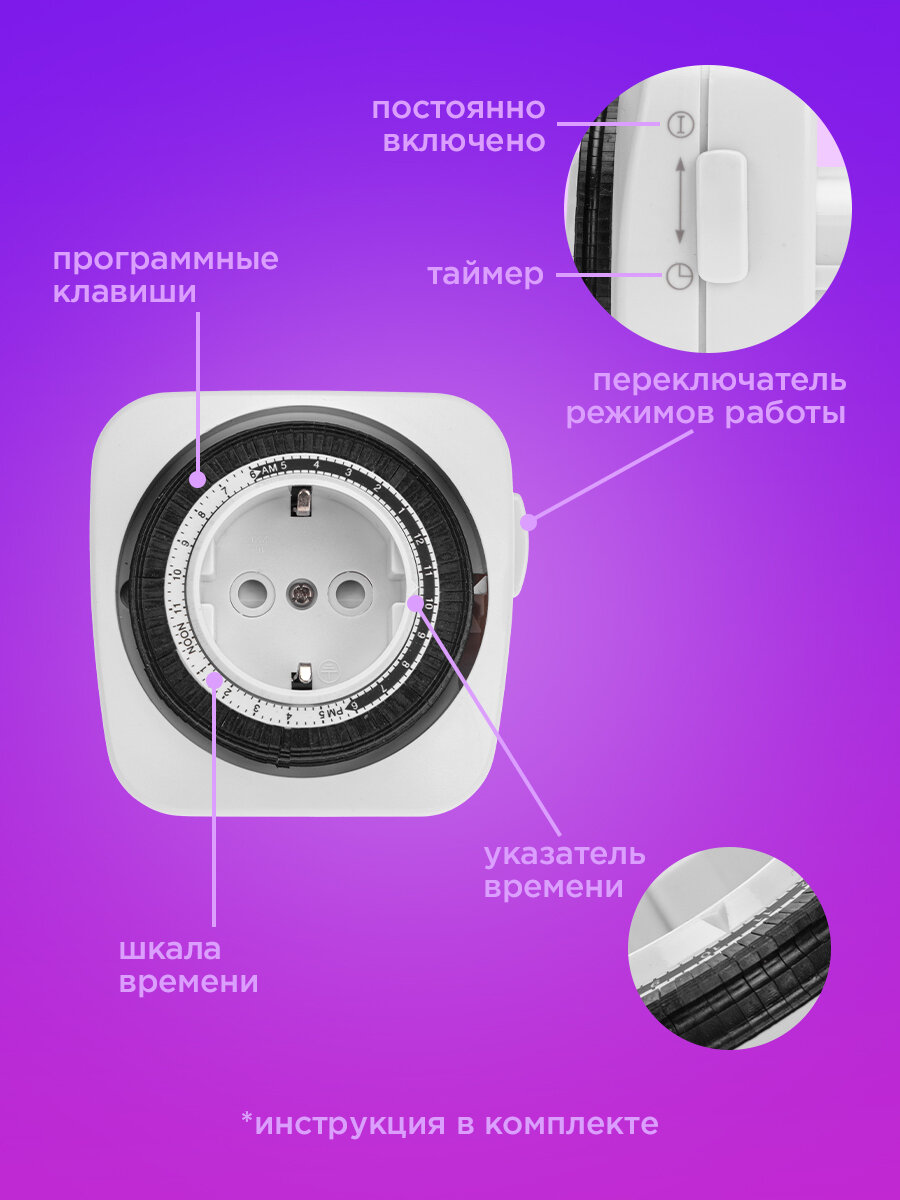 | Дополнительная информация | с механическим суточным таймером для включения и выключения домашних электроприборов (шаг 15 минут) |