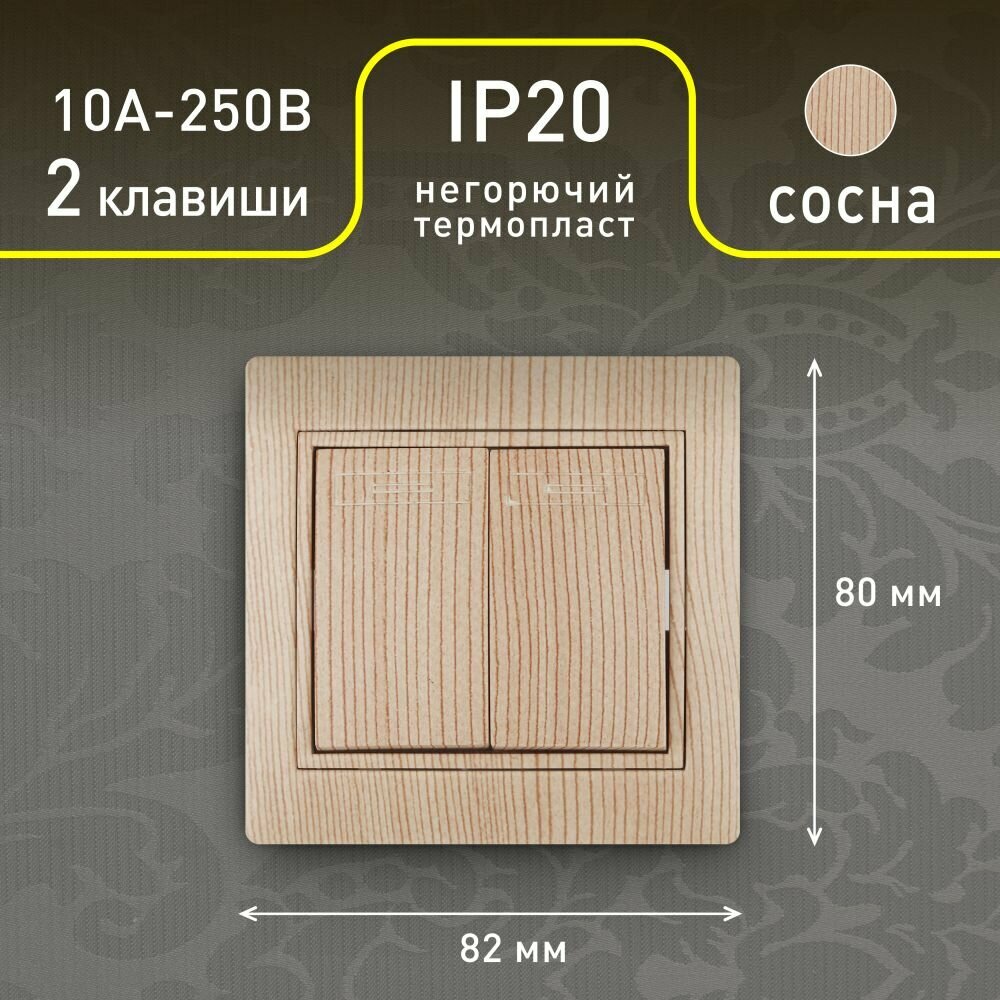 Выключатель Intro Plano 1-104-11 двухклавишный 10А-250В IP20 СУ Plano сосна информация: