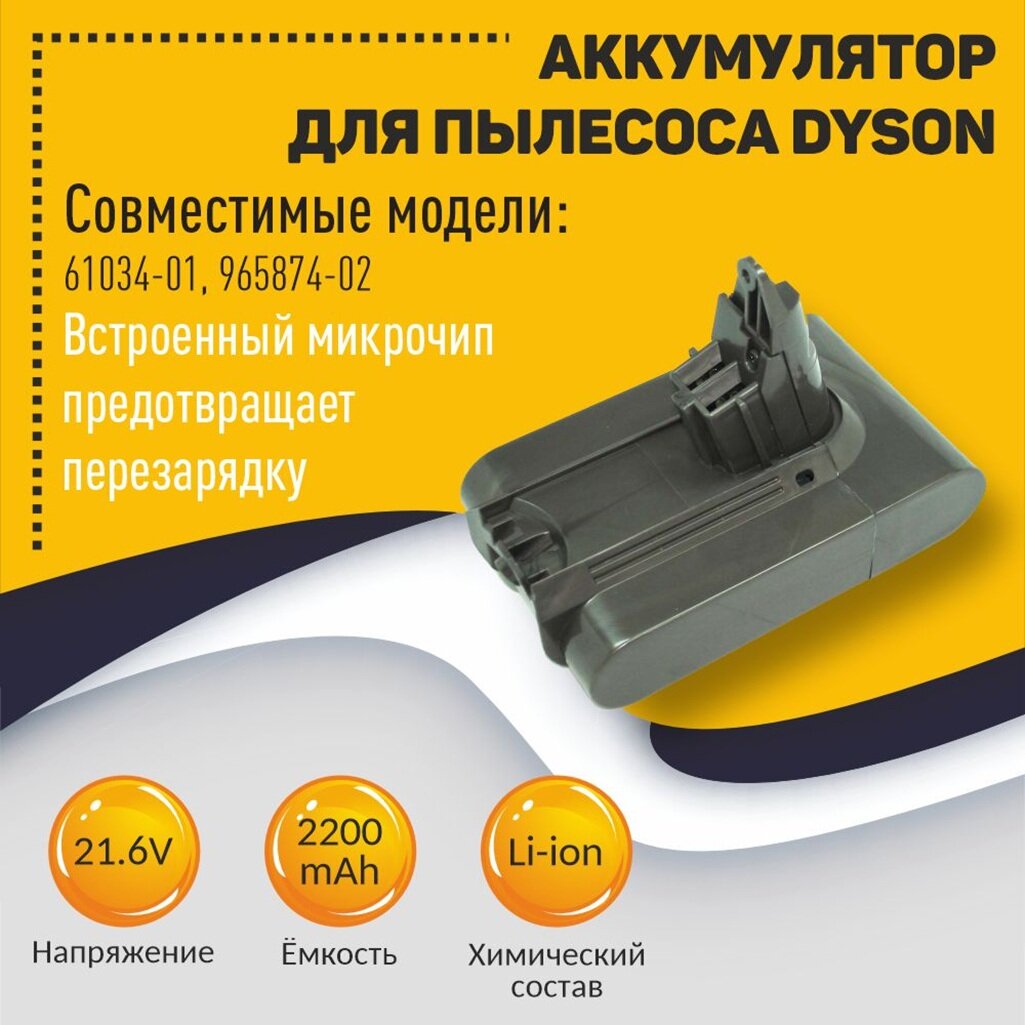 Аккумулятор для пылесоса Dyson V6, SV03, SV09, SV07, SV06, SV05 DC58 DC59 DC61 DC62 2.2Ah 21.6V информация:
