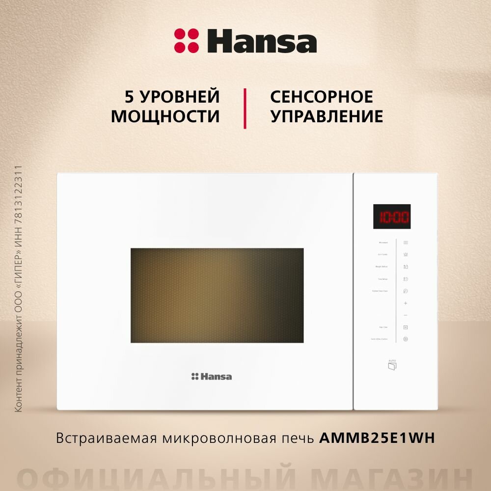Встраиваемая микроволновая печь Hansa AMMB25E1WH, 900 Вт, гриль с мощностью 1000 Вт, внутренняя камера на 25 литра из нержавеющей стали, размораживание по весу, блокировка управления 45 520 ₽