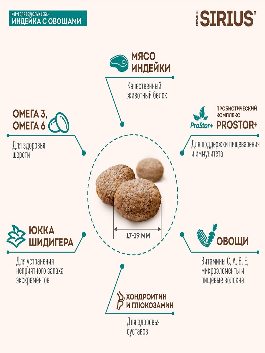 Сухой корм SIRIUS "Индейка с овощами" для взрослых собак крупных пород, 15кг информация: