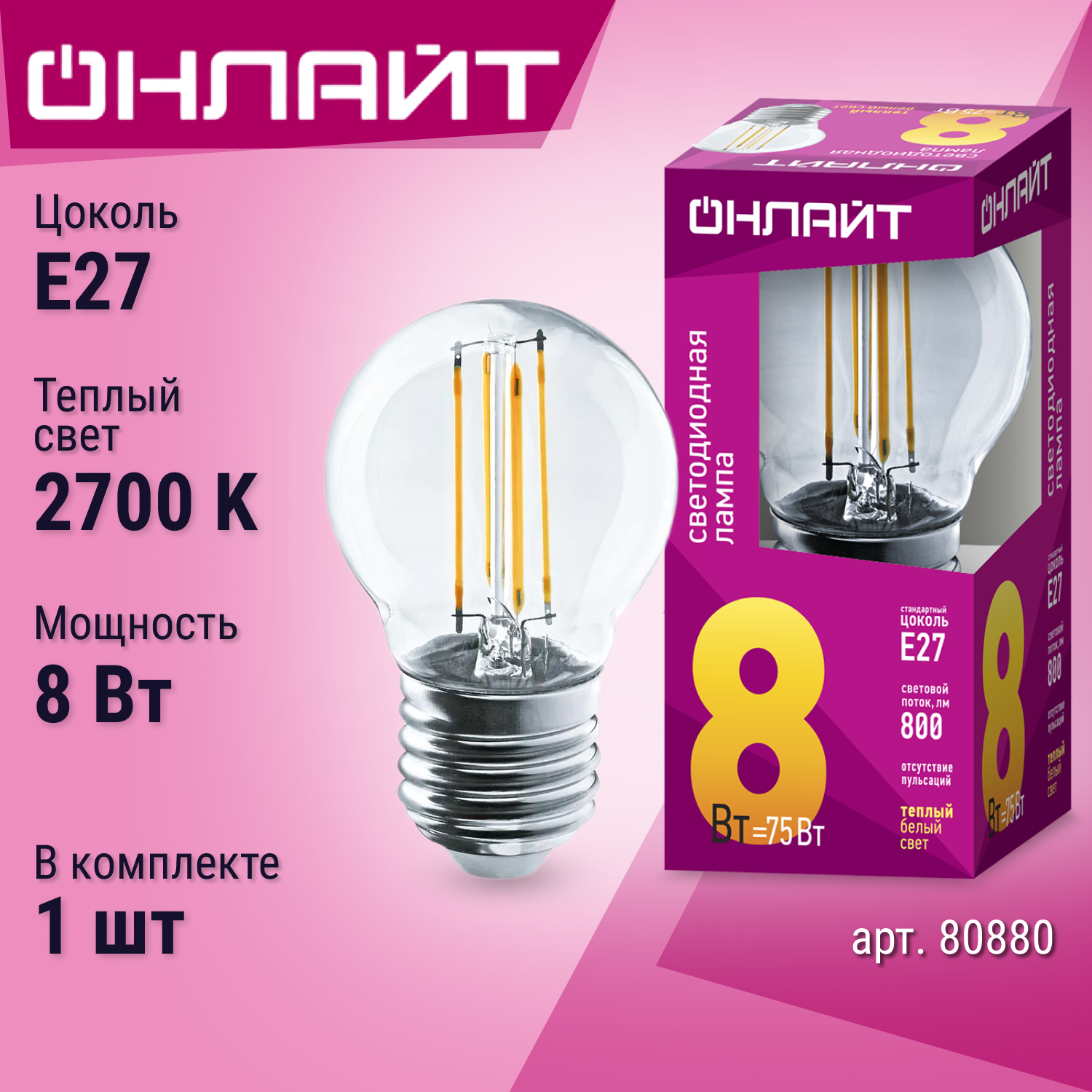 Лампа светодиодная филаментная 80 880 OLL-F-G45-08-230-2.7K-E27 8Вт шар прозрачная 2700К тепл. бел. E27 800лм 220-240В 80880 онлайт
