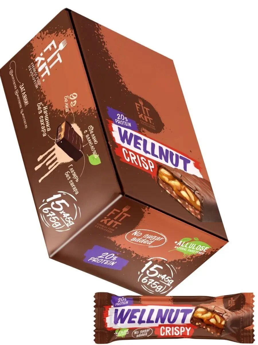 Протеиновый батончик FIT KIT Wellnut Crispy Protein BAR без сахара, 15штХ45г