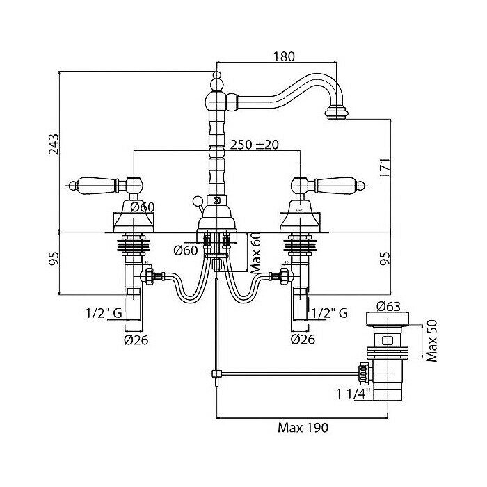 Смеситель для раковины Cezares Diamond на три отверстия, с донным клапаном, хром, ручки Swarovski (Diamond-BLS2-01-Sw) 54 033 ₽
