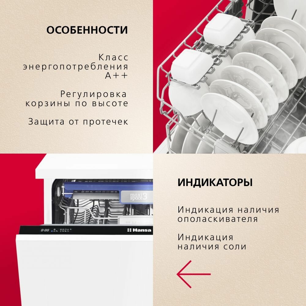 Встраиваемая посудомоечная машина Hansa ZIM608EH, 60 см, с защитой от протечек, 8 программ, 3 корзины, режим быстрой мойки и половинной загрузки, отсрочка старта информация: