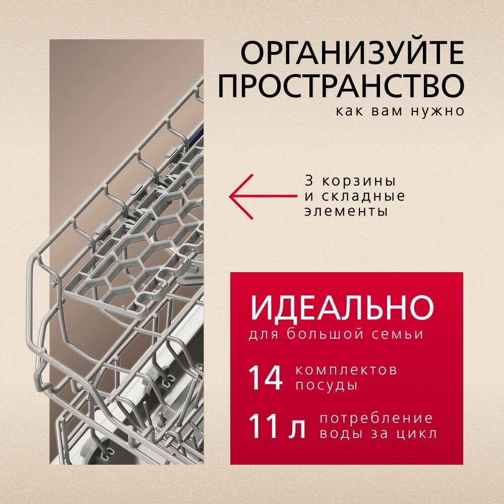 | Особенности конструкции | внутренняя поверхность из нержавеющей стали / дисплей / регулируемая по высоте корзина для посуды / таймер отсрочки |