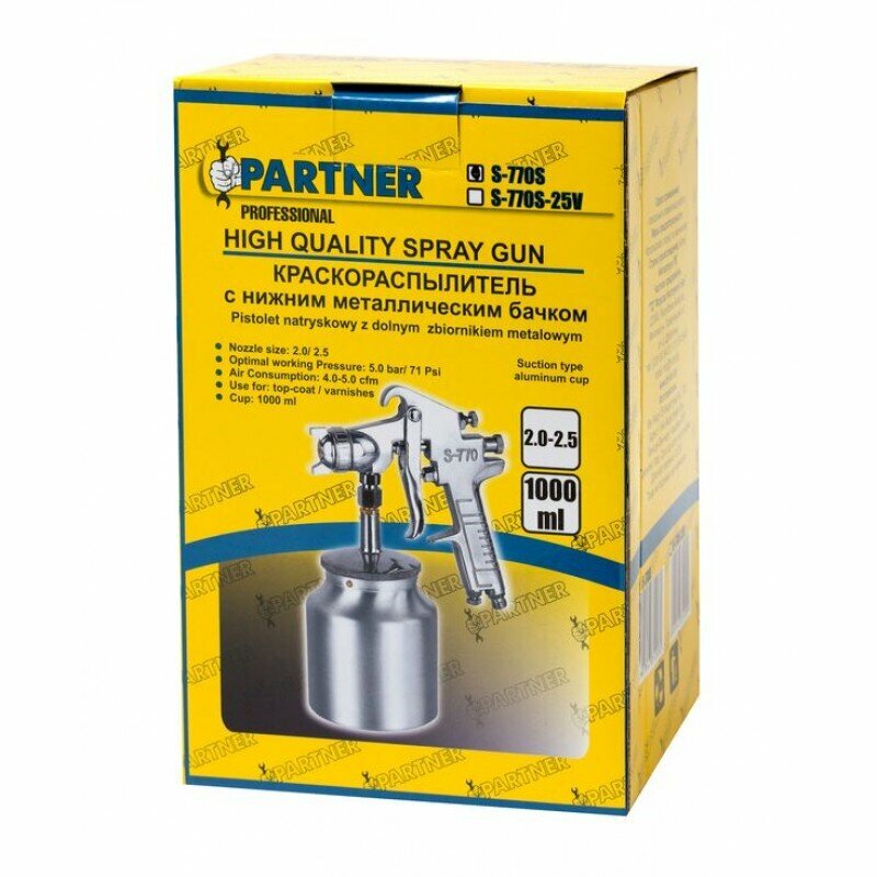 PARTNER S-770S Краскораспылитель пневматический сопло 2.5 мм, 5 Bar, расход воздуха 113-141 л/мин, с нижним металлическим бачком 1000 мл, присоед. резьба 1/4 дюйма, + аксессуары для чистки