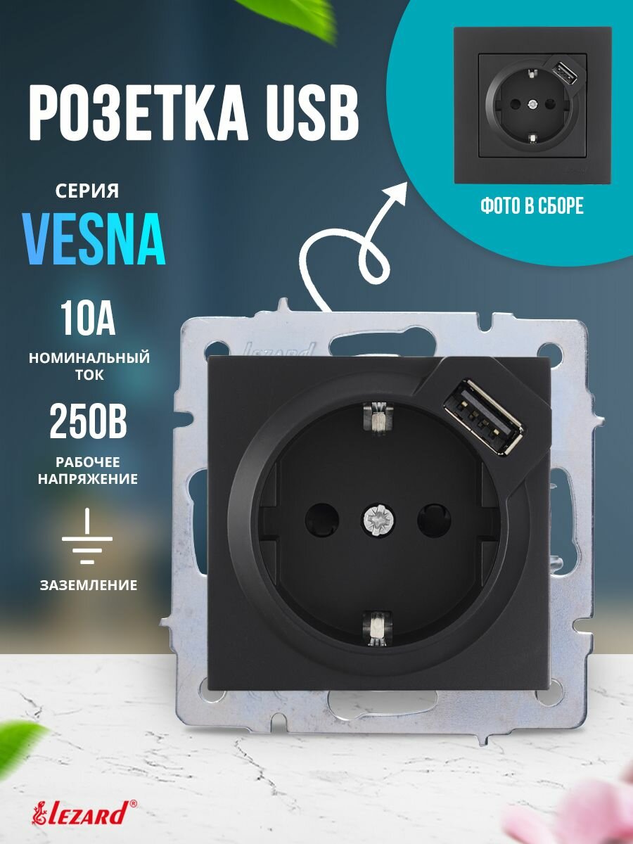 Отзывы на Розетка 1-м СП Vesna с заземл. с заряд. устройством USB механизм черн. бархат LEZARD , 742-4288-181