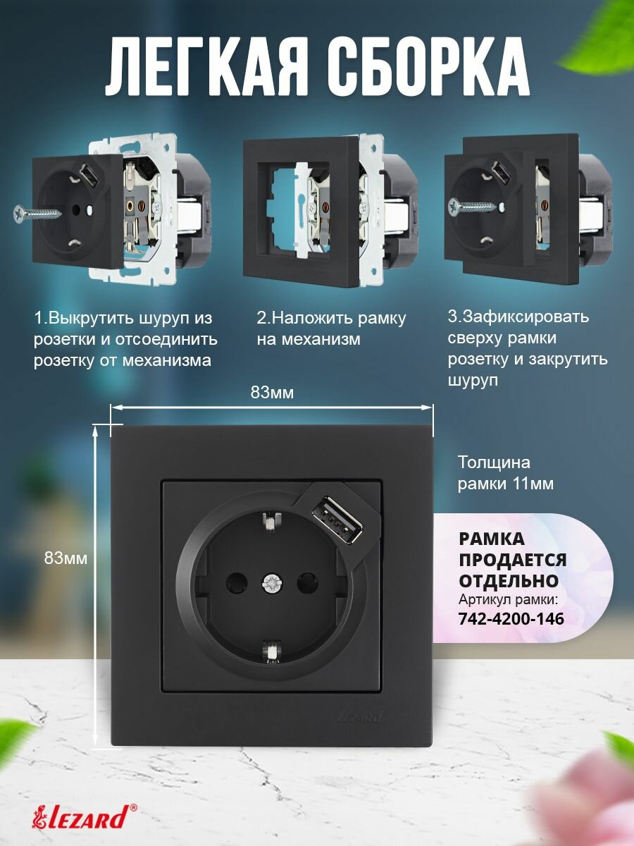 Розетка 1-м СП Vesna с заземл. с заряд. устройством USB механизм черн. бархат LEZARD , 742-4288-181 информация: