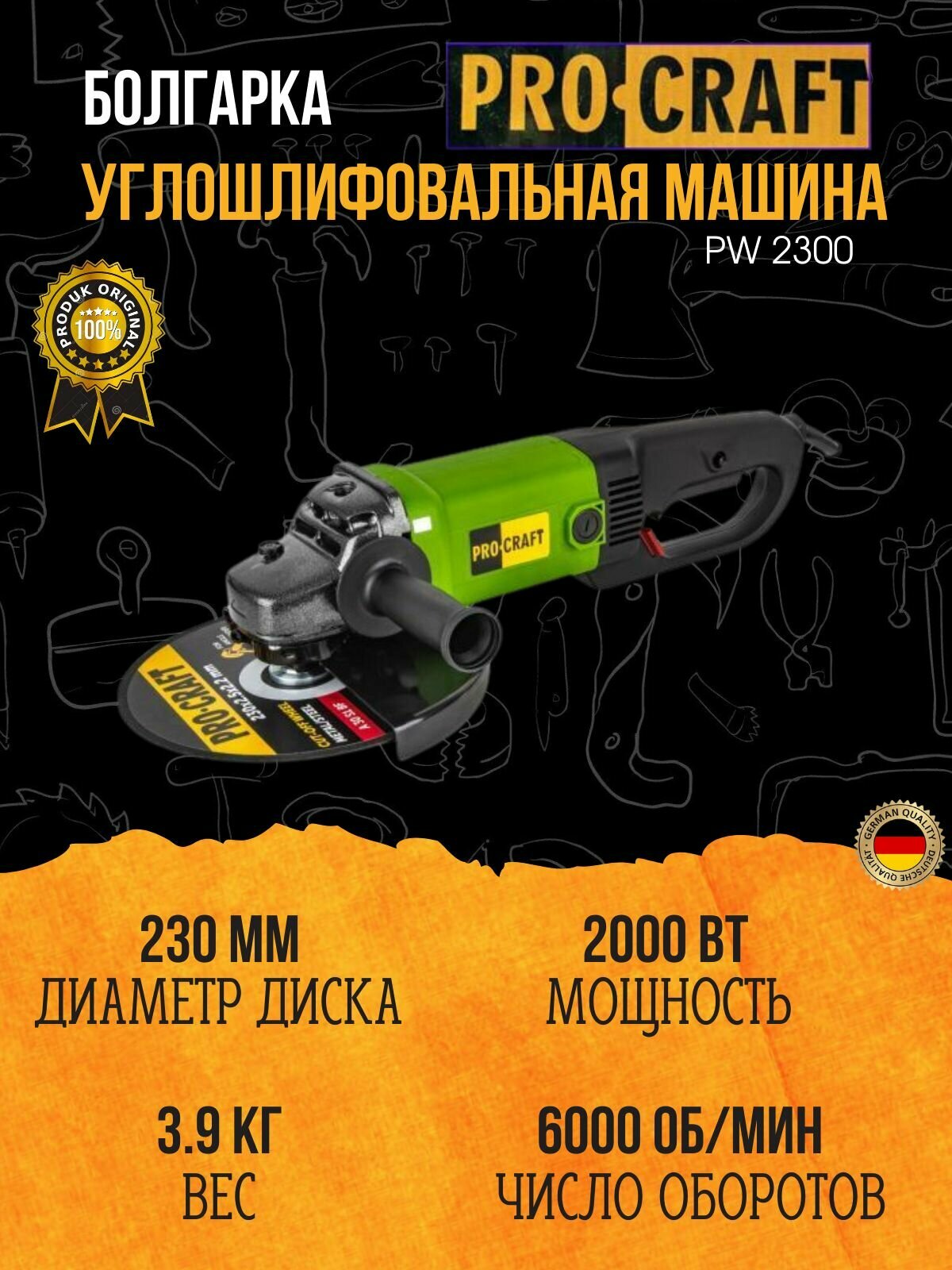 Углошлифовальная машина болгарка Procraft PW 2300, 230мм круг, 2300Вт, 6000об/мин
